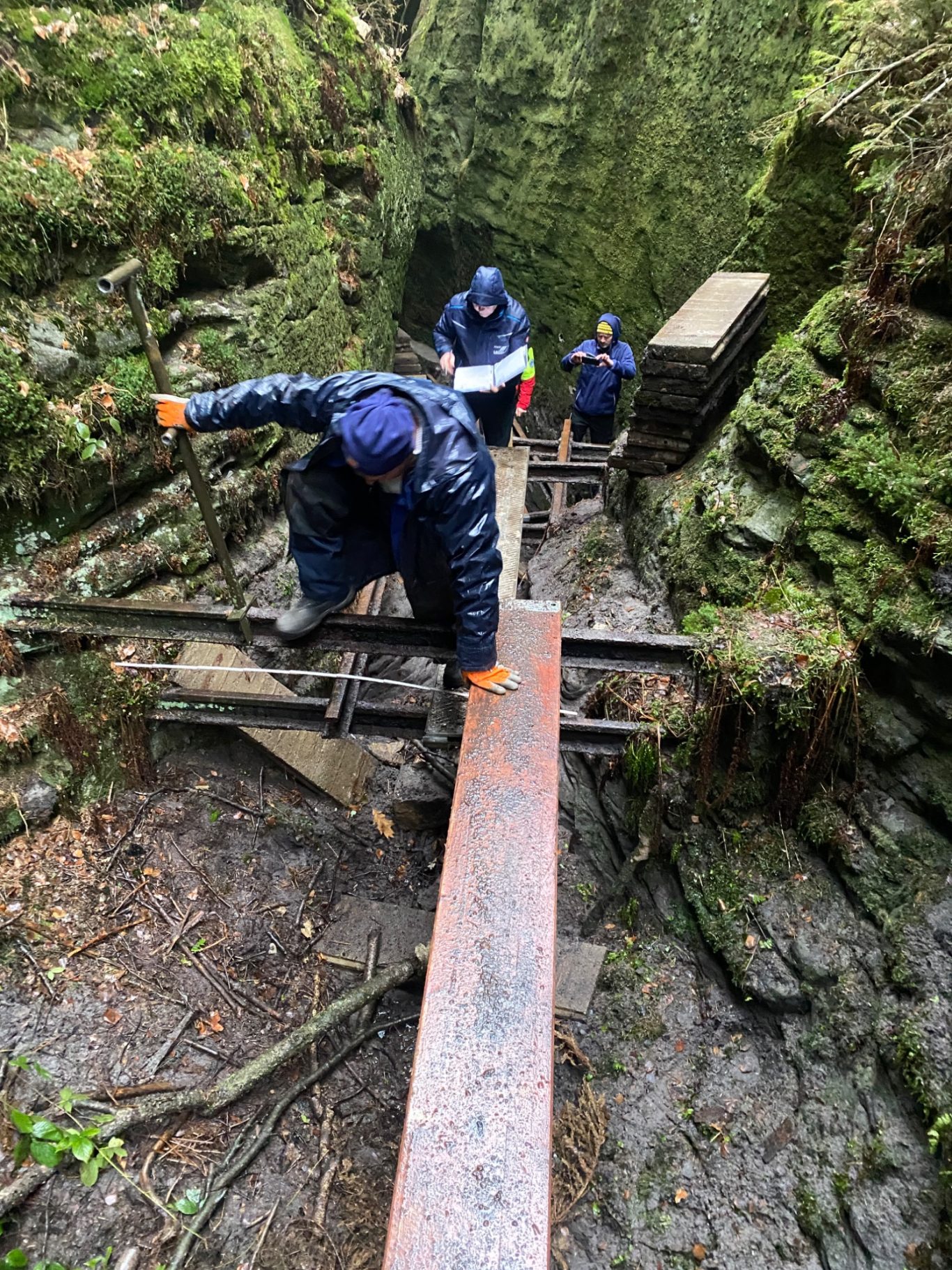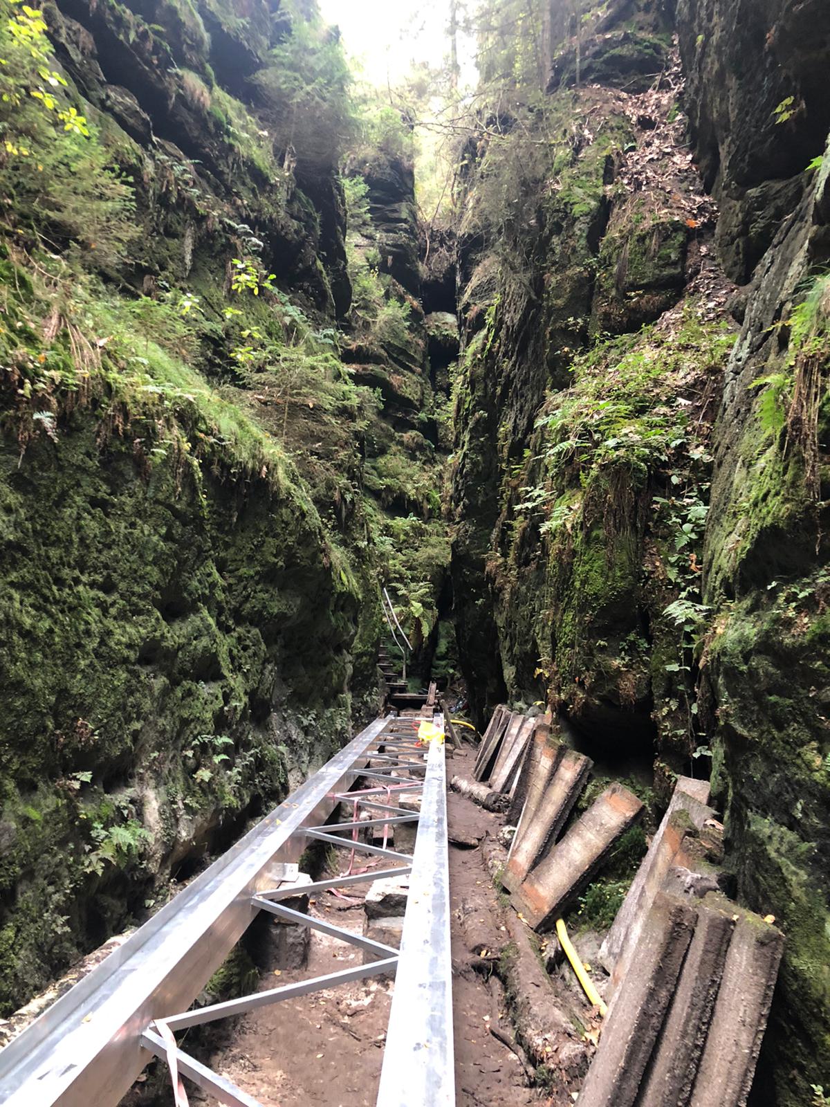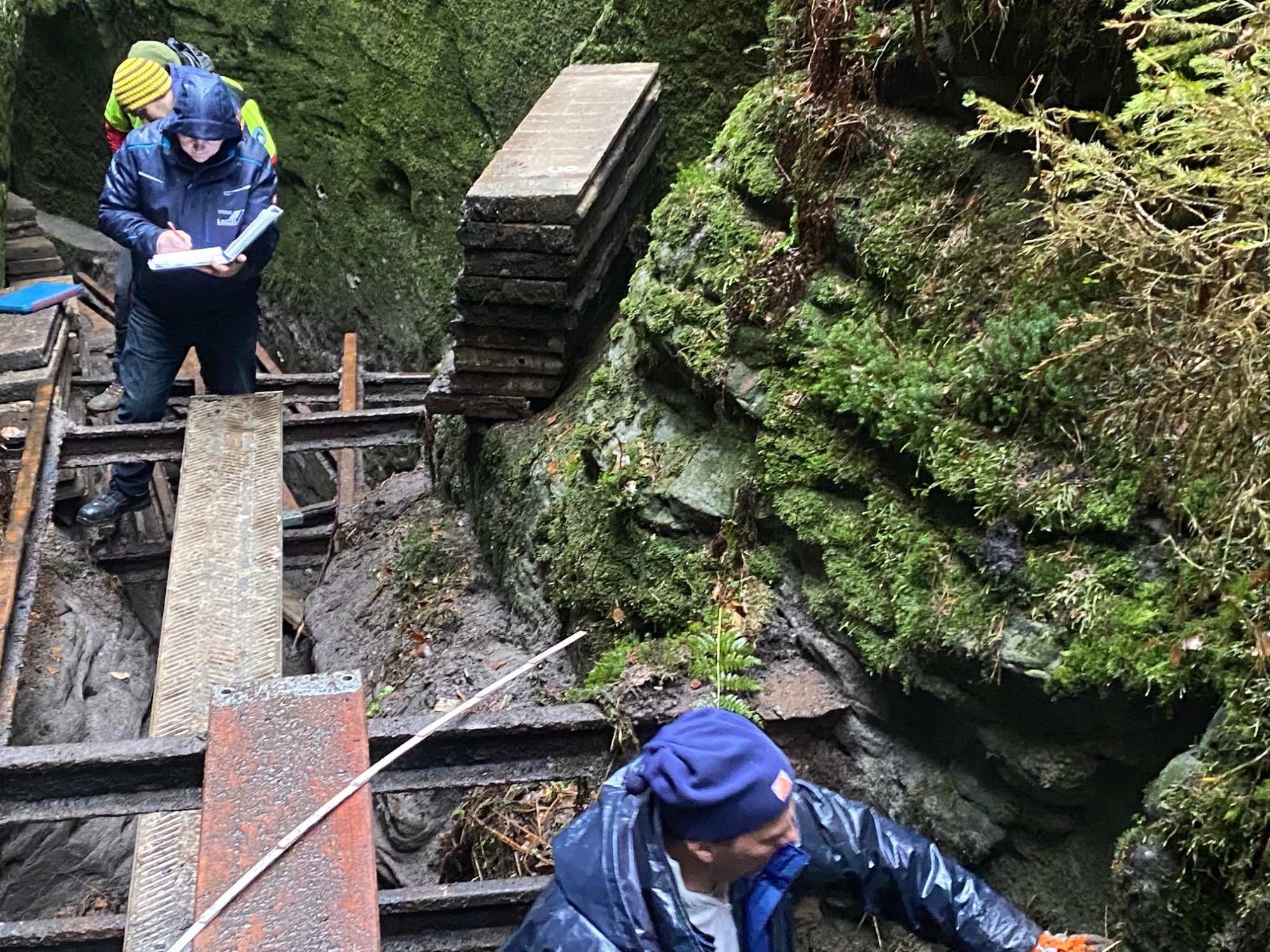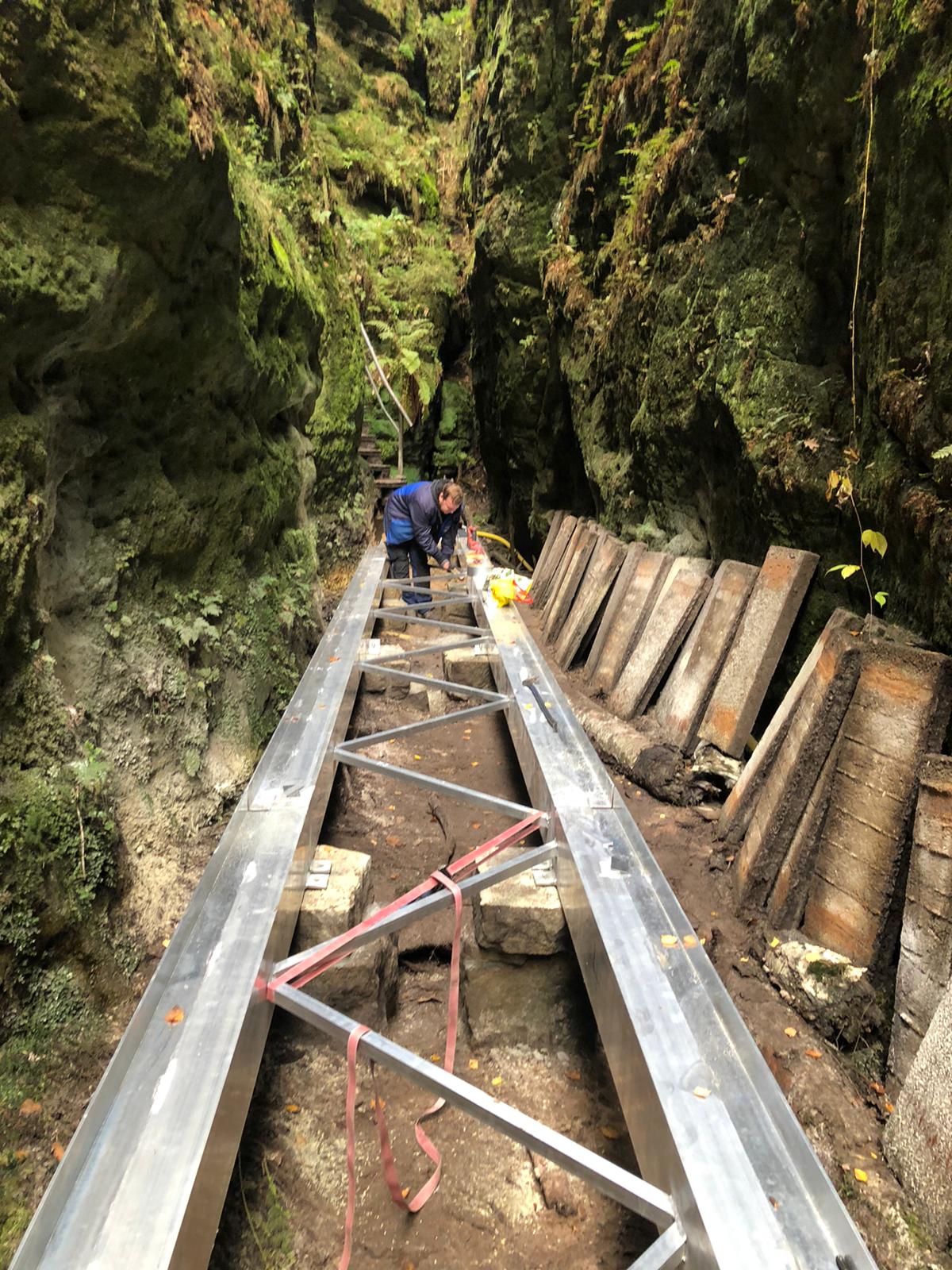 Bei Wind und Wetter mussten Tonnen an Stahl, Steinen und Arbeitsmitteln bis tief in die Schluchten oder über tiefe Abgründe bewegt werden. Durch das Natiurschutzgebiet war der Einsatz von schweren Hilfsmitteln untersagt. Eine Zerreißprobe für alle Beteiligten. Der Wanderweg durch die Schwedenlöcher ist jedes Jahr hoch frequentiert.