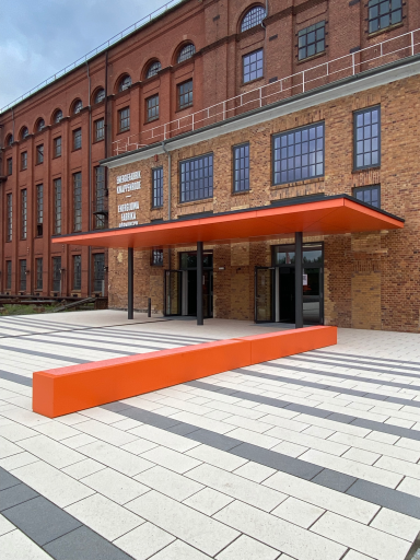Auf dem Vorplatz des Industriemuseums entstanden zwei große, eindrucksvolle Stahlüberdachungen. Diese wurden mit Trespa-Elementen in den charakteristischen Orangetönen des Museums verkleidet und setzen als markante Gestaltungselemente einen starken visuellen Akzent. Für die Konstruktion und Montage wurden mehrere Tonnen Stahl verarbeitet.
