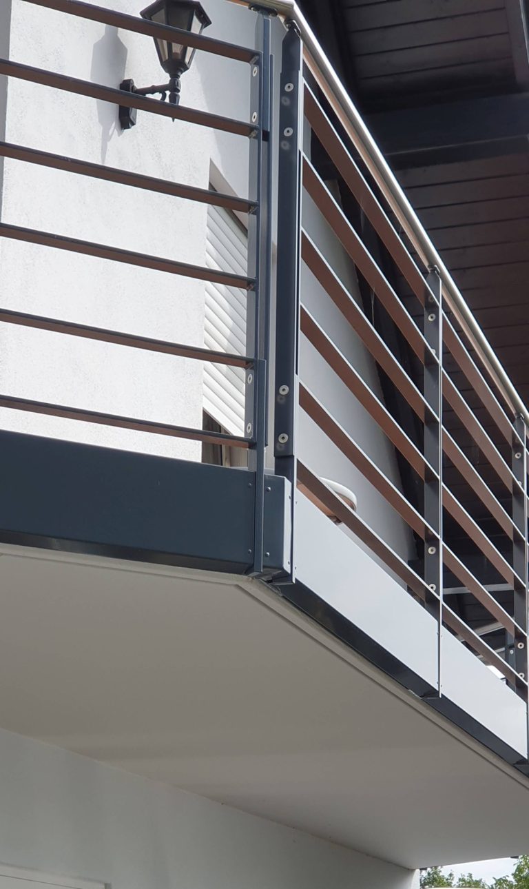 Stahlgeländer mit Pulverbeschichtung und einer blickdichten Trespa Verkleidung. Sehr langlebig und robust. Viele Farbvarianten möglich.