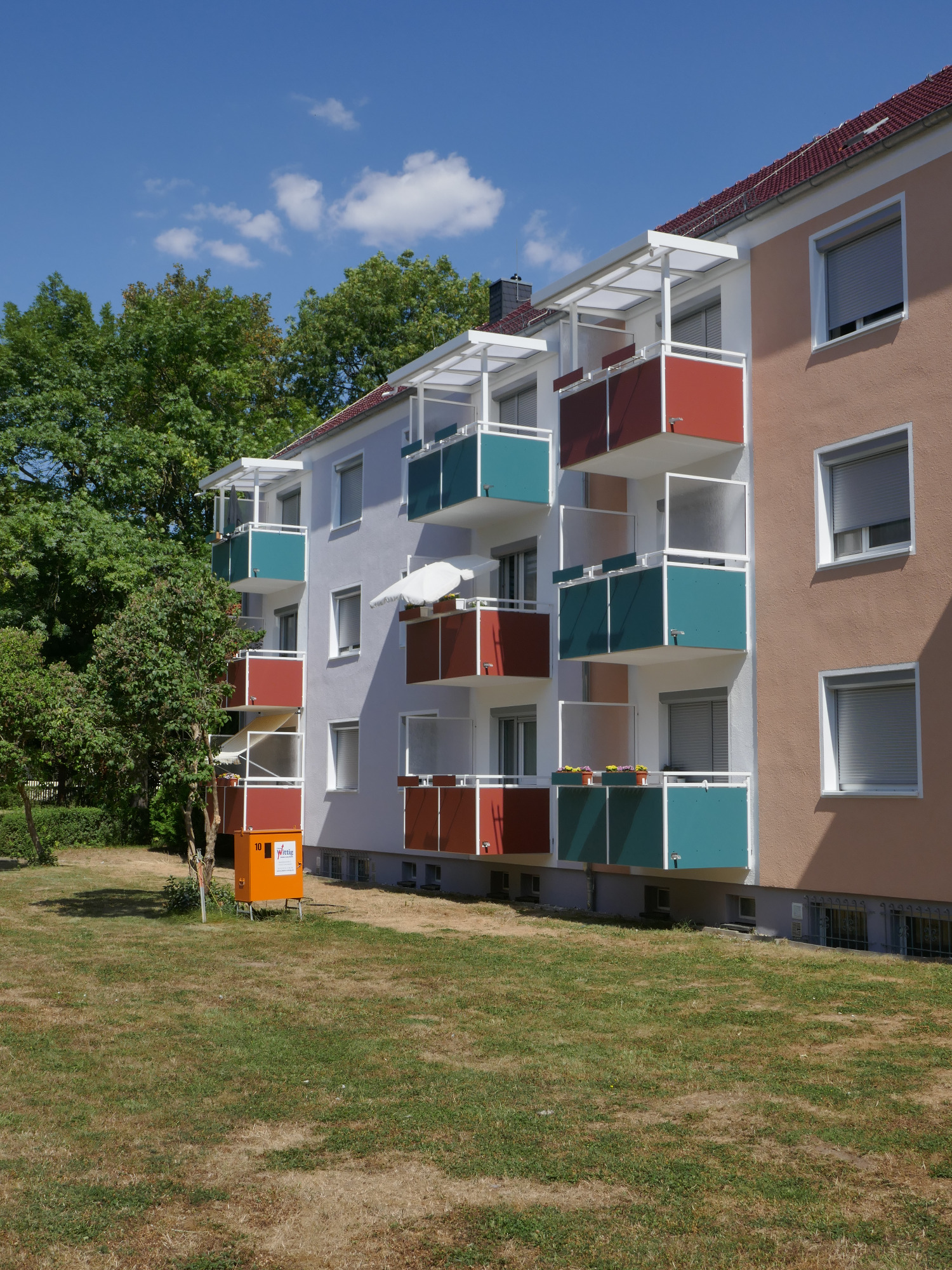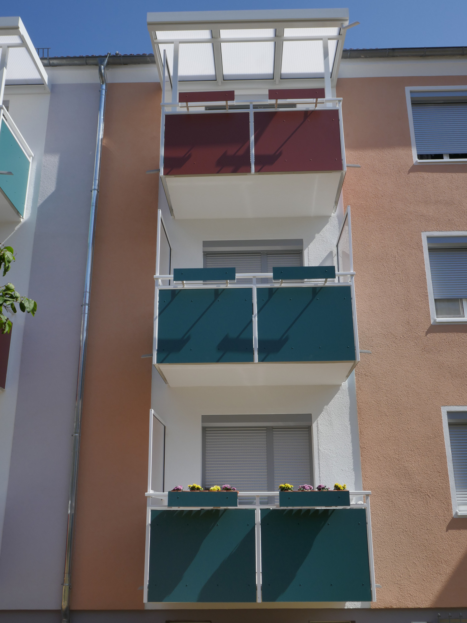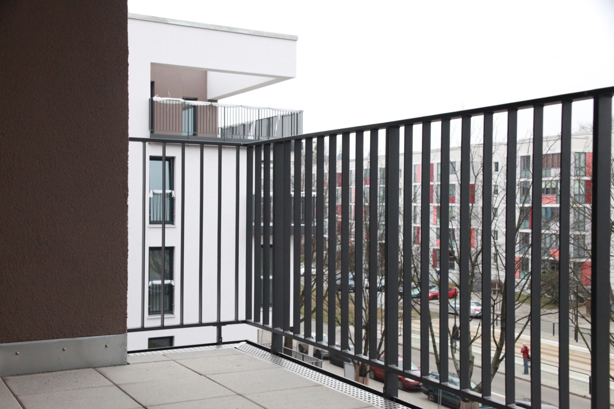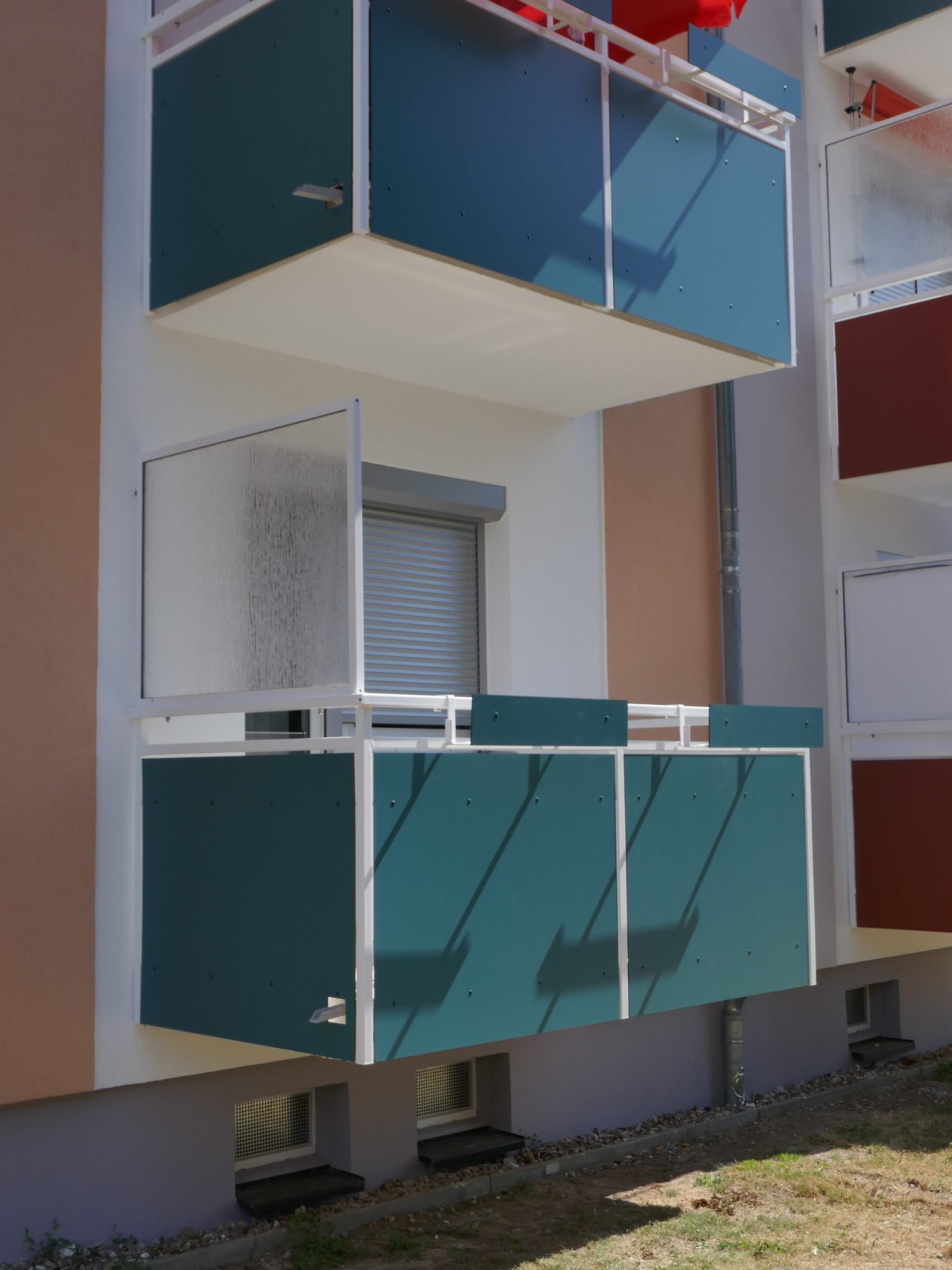 Stahlgeländer mit Pulverbeschichtung und einer blickdichten Trespa Verkleidung. Sehr langlebig und robust. Viele Farbvarianten möglich.