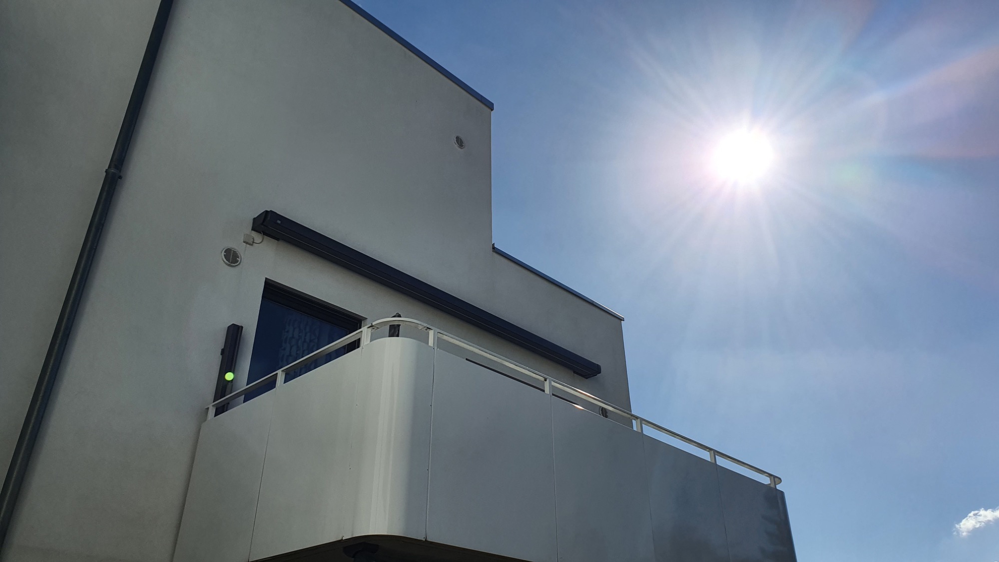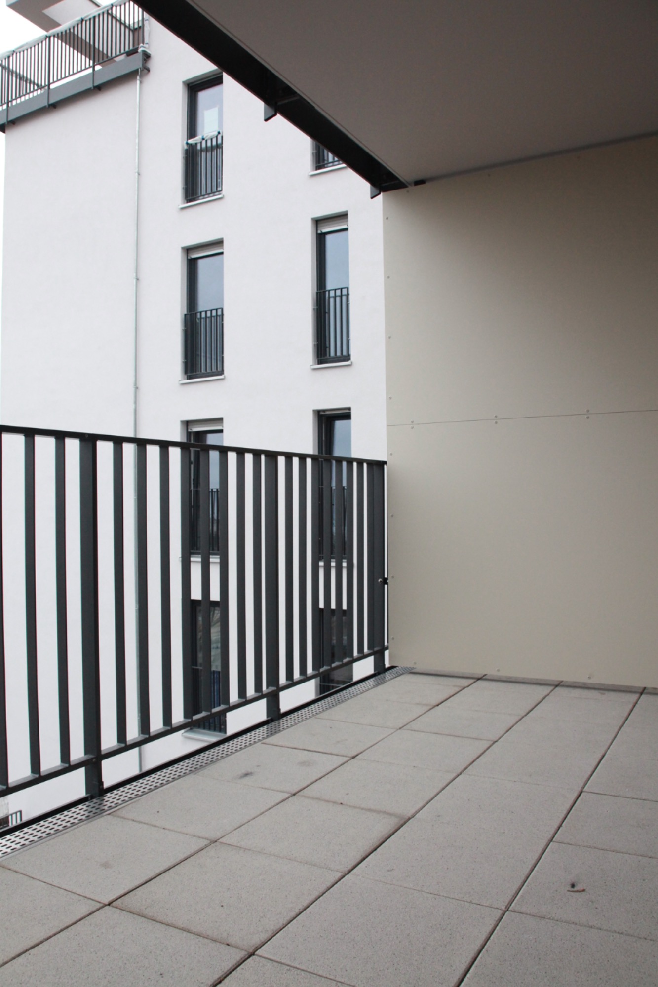 Stahlgeländer verzinkt mit anschließender Pulverbeschichtung in weiß und einer Aluminiumfüllung. Blickdicht für Privatsphäre.