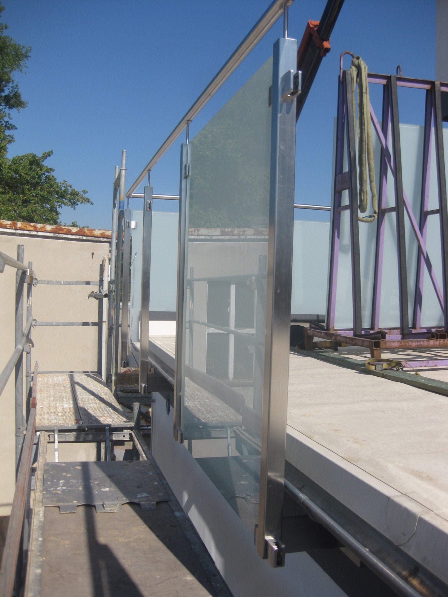 Edelstahlgeländer mit Milchglasfüllung. Aufgesetzter Handlauf aus Rundrohr, Gläser mit Glashaltern gehalten.